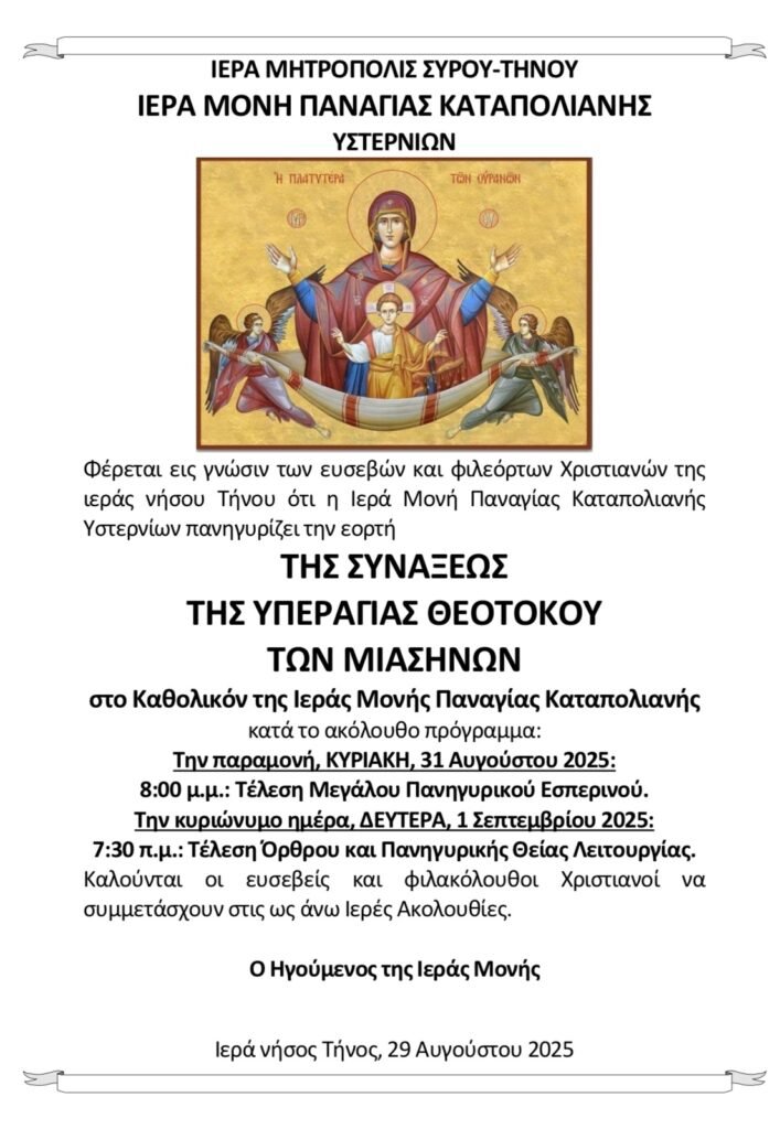 Οι ιερές ακολουθίες θα τελεστούν την Κυριακή 31 Αυγούστου και τη Δευτέρα 1 Σεπτεμβρίου 2025.