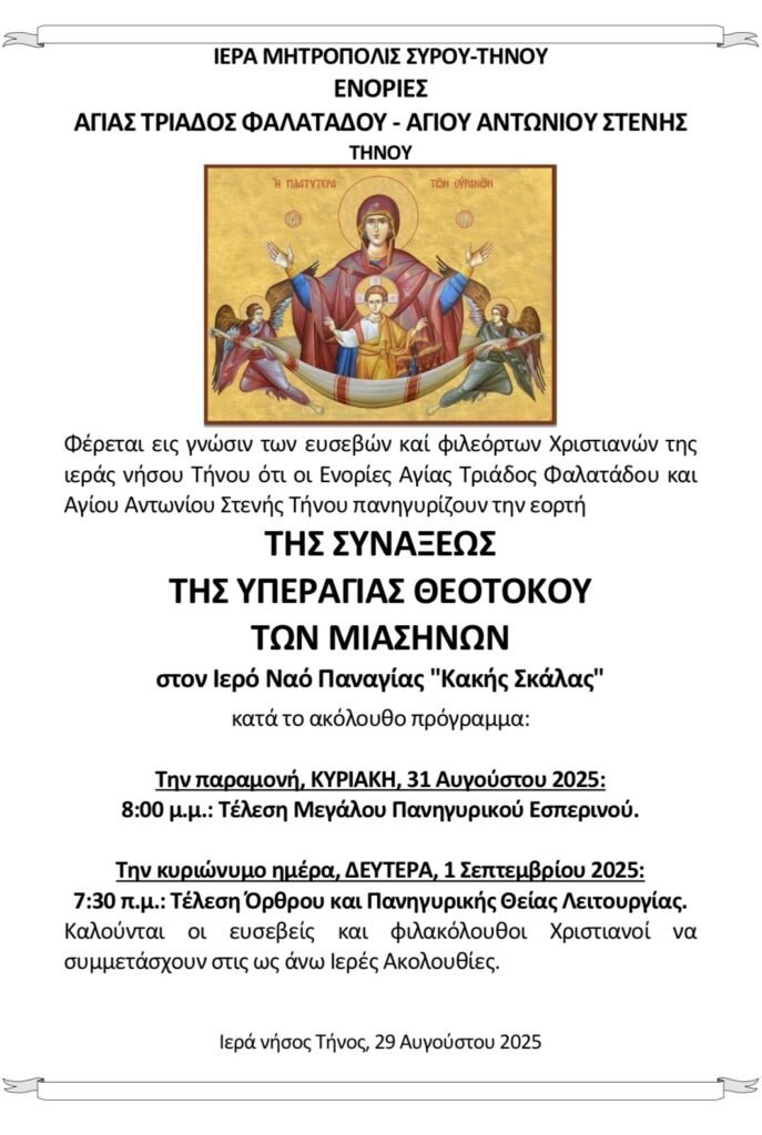 Οι ενορίες Αγίας Τριάδος Φαλατάδου και Αγίου Αντωνίου Στενής Τήνου τιμούν τη Σύναξη της Υπεραγίας Θεοτόκου των Μιασηνών.