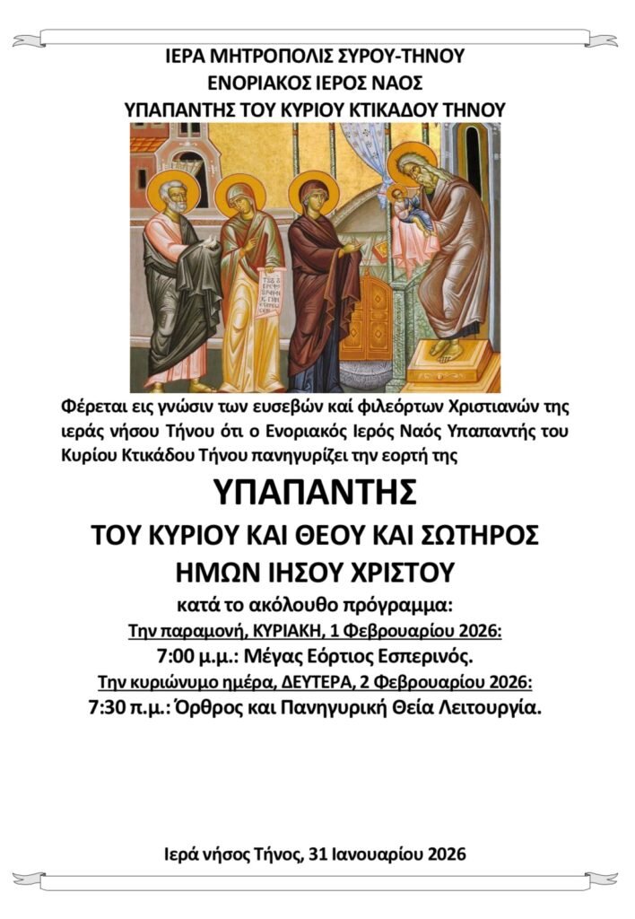 Ο Ενοριακός Ιερός Ναός Υπαπαντής του Κυρίου στον Κτικάδο Τήνου πανηγυρίζει την εορτή της Υπαπαντής του Κυρίου και προσκαλεί τους πιστούς να συμμετάσχουν στις ιερές ακολουθίες.