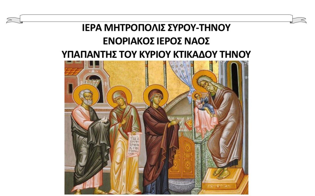 Ο Ενοριακός Ιερός Ναός Υπαπαντής του Κυρίου στον Κτικάδο Τήνου πανηγυρίζει την εορτή της Υπαπαντής του Κυρίου και προσκαλεί τους πιστούς να συμμετάσχουν στις ιερές ακολουθίες.