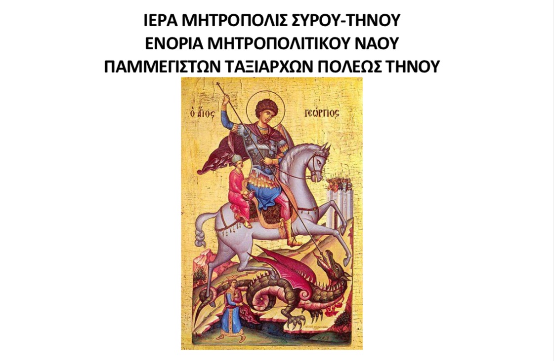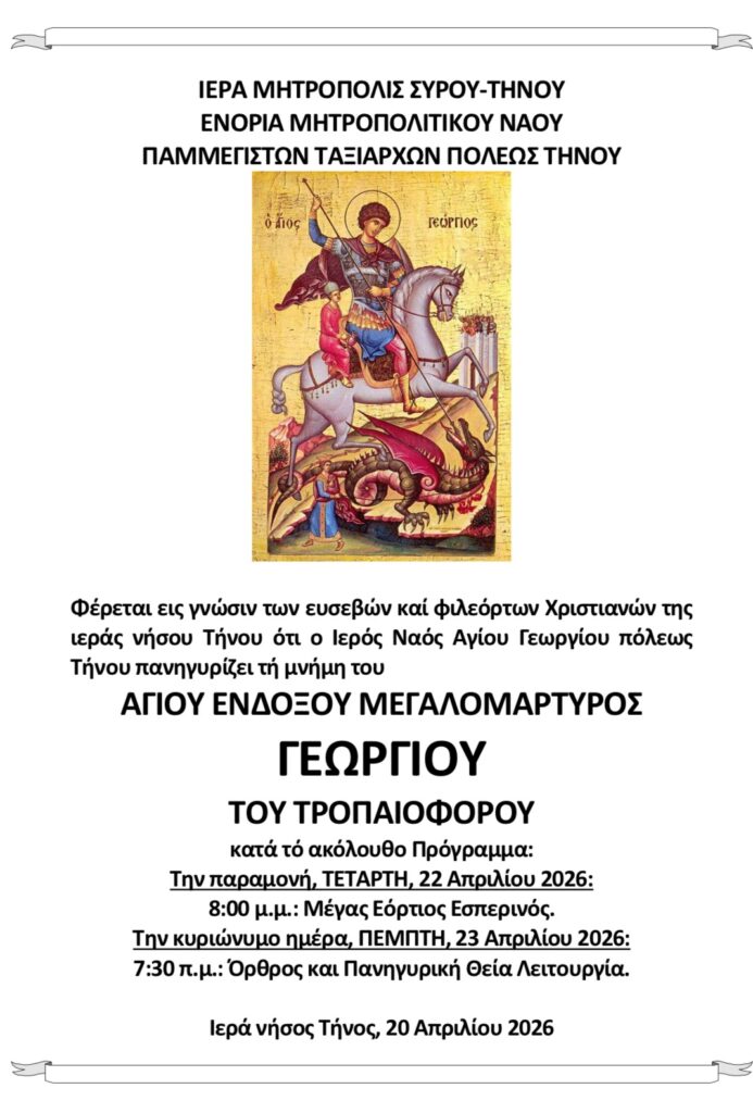 Φέρεται εις γνώσιν των ευσεβών και φιλεόρτων Χριστιανών της ιεράς νήσου Τήνου ότι ο Ιερός Ναός Αγίου Γεωργίου πόλεως Τήνου πανηγυρίζει τη μνήμη του