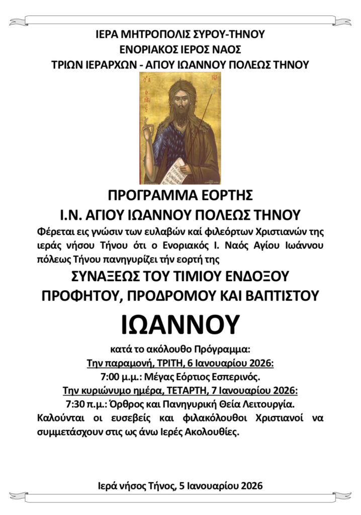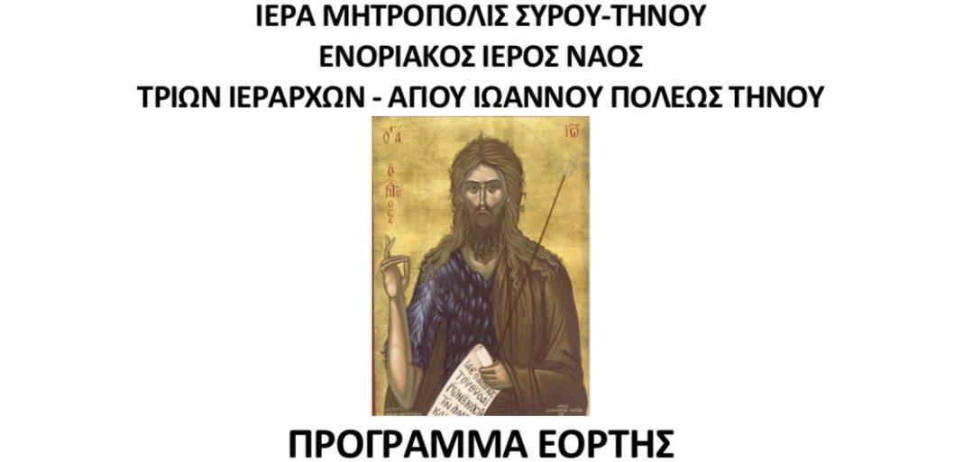 Ο Ιερός Ναός Αγίου Ιωάννου Μουντάδου και ο Ιερός Ναός Αγίου Ιωάννου Πόλεως Τήνου πανηγυρίζουν την εορτή της Συνάξεως του Τιμίου Ενδόξου Προφήτου, Προδρόμου και Βαπτιστού Ιωάννου, σύμφωνα με το ανακοινωθέν πρόγραμμα των Ιερών Ακολουθιών.