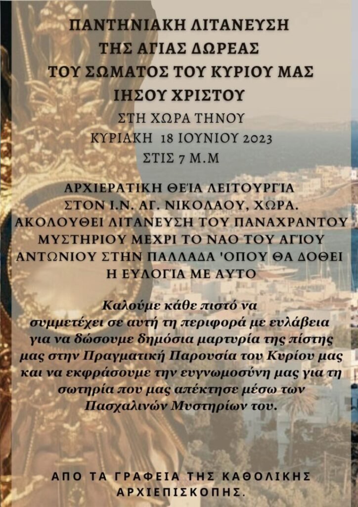 Ακολουθεί Λιτάνευση του Παναχράντου Μυστηρίου μέχρι το Ναό του Αγίου Αντωνίου στην Παλλάδα όπου θα δοθεί η ευλογία με αυτό.