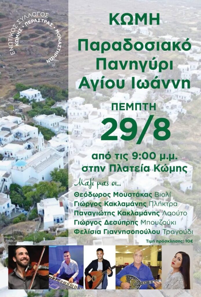Την Πέμπτη 29 Αυγούστου, από τις 9:00 μ.μ., στην πλατεία Κώμης, θα πραγματοποιηθεί το Παραδοσιακό Πανηγύρι του Αγίου Ιωάννη. Μαζί μας θα είναι οι: