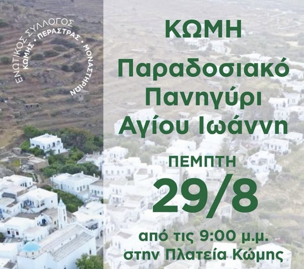Την Πέμπτη 29 Αυγούστου, από τις 9:00 μ.μ., στην πλατεία Κώμης, θα πραγματοποιηθεί το Παραδοσιακό Πανηγύρι του Αγίου Ιωάννη. Μαζί μας θα είναι οι: