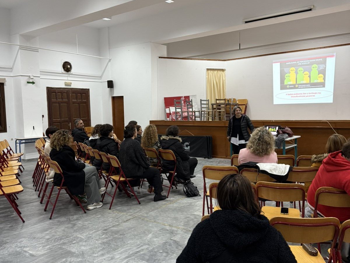Στο πλαίσιο της συγκεκριμένης παρέμβασης πραγματοποιήθηκε την Πέμπτη 23 Ιανουαρίου στην Αίθουσα Πολλαπλών Χρήσεων ομιλία-συζήτηση «Εφηβεία και εξαρτήσεις» με γονείς μαθητών Δευτεροβάθμιας Εκπαίδευσης με τη συμμετοχή 30 γονέων.