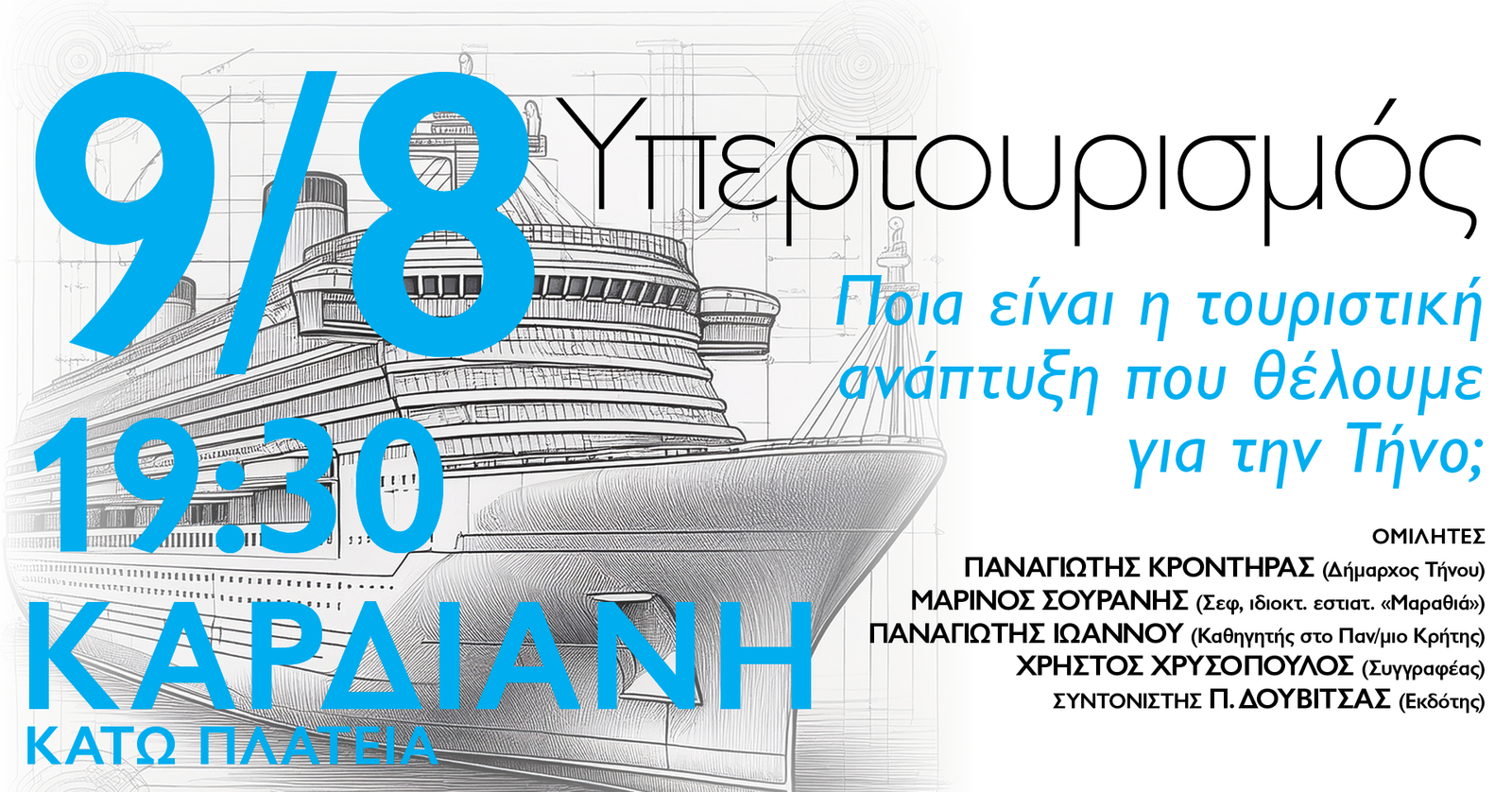 Βέβαια, με την αντωνυμία «ποια», μετριάζεται κάπως η δυσοίωνη πρόβλεψη. Σαν να λέμε δηλαδή: «Θέλουμε την «άσπρη» και όχι τη «μαύρη», την «καλή» και όχι την «κακή», «τουριστική ανάπτυξη» για την Τήνο. Ο υπέρτιτλος «υπερτουρισμός» και η γραφική παράσταση του τερατώδους και τρομαχτικού κρουαζιερόπλοιου ενισχύουν αυτήν την εντύπωση του «μέτρου».