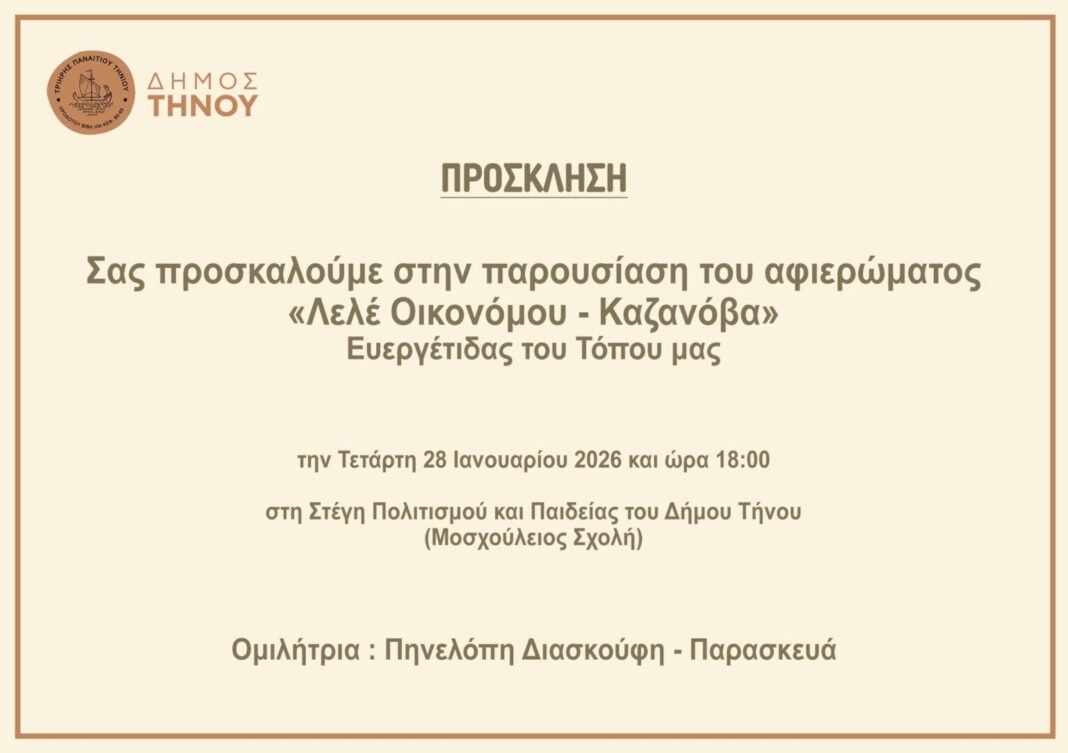 Ο Δήμος Τήνου σας προσκαλεί στην παρουσίαση του αφιερώματος στην Ευεργέτιδα του τόπου μας, Λελέ Οικονόμου – Καζανόβα, η οποία θα πραγματοποιηθεί την Τετάρτη 28 Ιανουαρίου και ώρα 18:00, στη Στέγη Πολιτισμού και Παιδείας του Δήμου Τήνου (Μοσχούλειος Σχολή).
