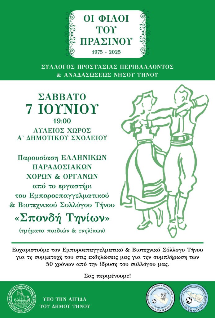 Ο Σύλλογος Προστασίας Περιβάλλοντος & Αναδασώσεως Νήσου Τήνου «Οι Φίλοι του Πρασίνου», στο πλαίσιο του εορτασμού των 50 χρόνων από την ίδρυσή του (1975 – 2025), σας προσκαλεί σε μια ξεχωριστή εκδήλωση: