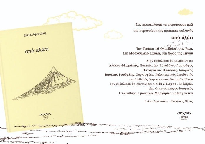 Σας προσκαλούμε να γιορτάσουμε μαζί την παρουσίαση της ποιητικής συλλογής «από αλάτι» της Ελίνας Αφεντάκη.