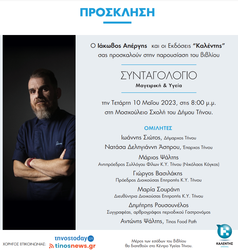 Την Τετάρτη 10 Μαΐου 2023, στις 8:00μ.μ. στη Μοσχούλειο Σχολή του Δήμου Τήνου.
