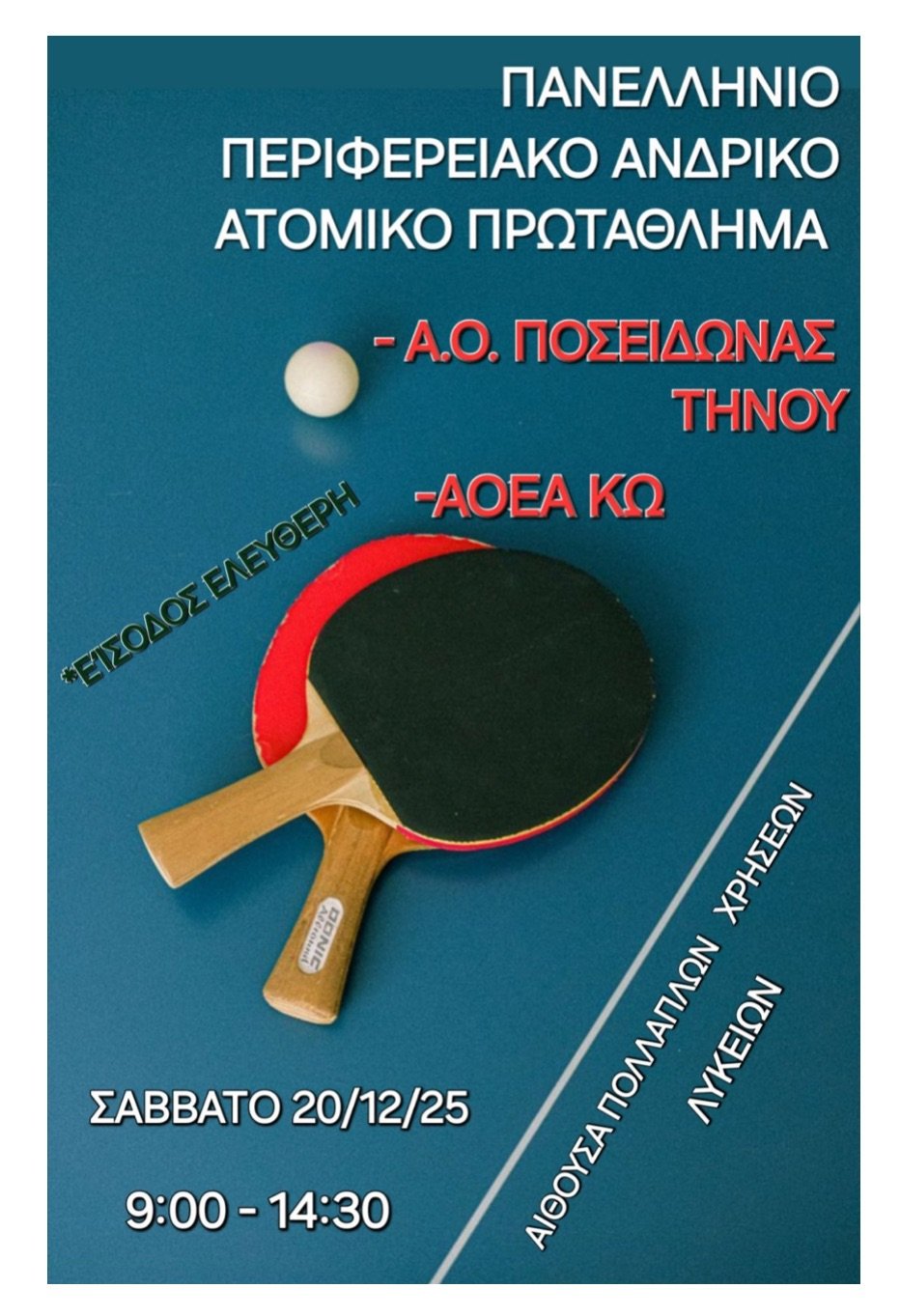 Στα πλαίσια του Πανελληνίου Περιφερειακού ανδρικού Πρωταθλήματος Πινγκ-Πονγκ θα γίνουν το Σάββατο 20 Δεκεμβρίου και ώρες 9-14.30 στη Τήνο αγώνες, στην αίθουσα πολλαπλών χρήσεων των Λυκείων. Οι αγώνες είναι ατομικοί και συμμετέχουν αθλητές της ομάδας Α.Ο. Ποσειδώνας Τήνου και της ομάδας Α.Ο.Ε.Α. Κω. Οι πέντε πρώτοι νικητές των αγώνων θα προκριθούν για τη τελική φάση του ανδρικού πρωταθλήματος μάλλον στην Αθήνα, που θα γίνει Μάρτιο με Απρίλιο 2026. Το ίδιο θα γίνει και από άλλες περιφέρειες της Ελλάδας. Ευχαριστίες για τη φιλοξενία των αθλητών στον κ. Σπανό Γιάννη, δωμάτια «Μούσες» και στον κ. Ξανθάκη Μιχάλη, δωμάτια «Ἑσπερίδες».