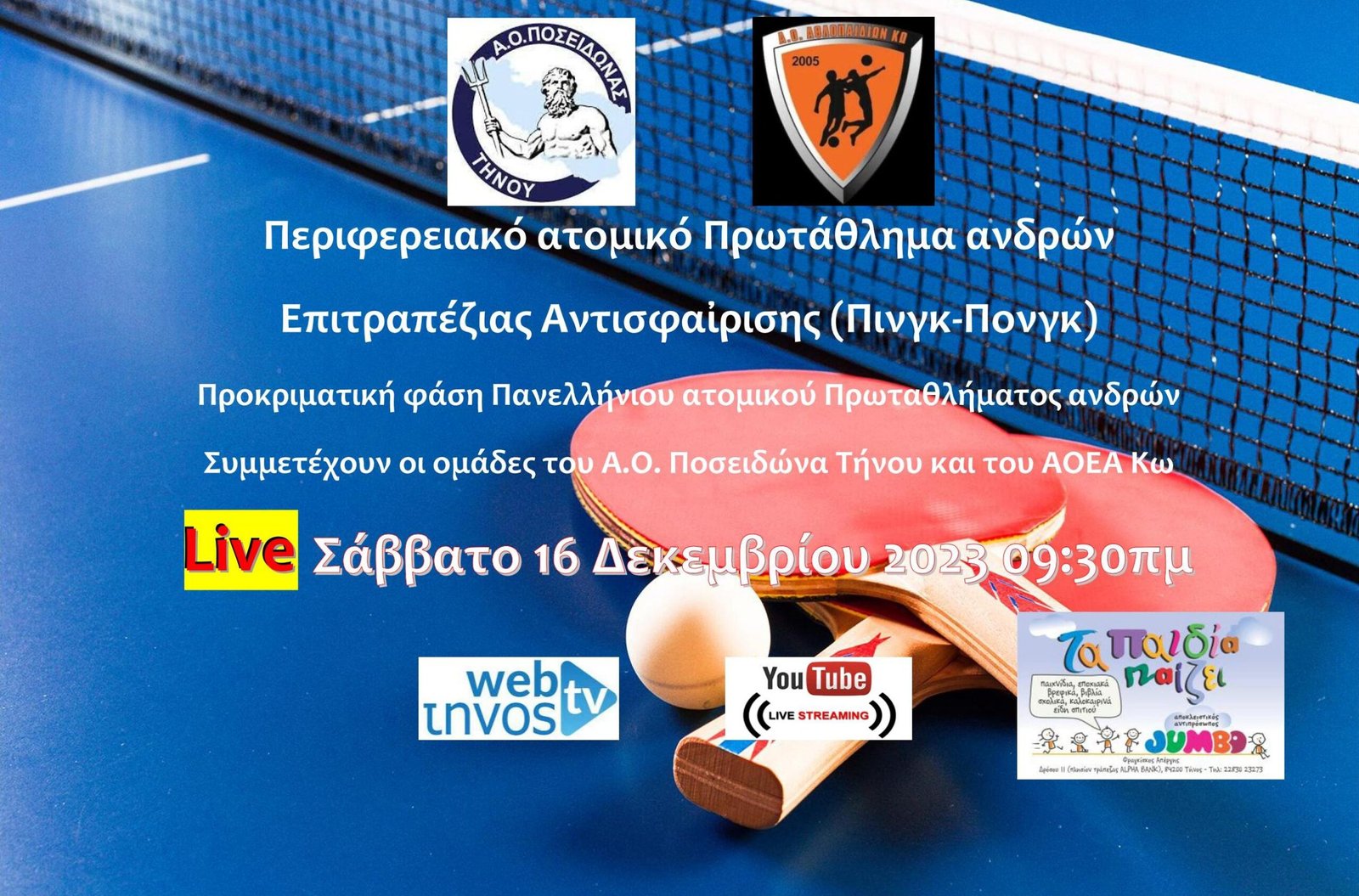 Περιφερειακό ατομικό Πρωτάθλημα ανδρών Επιτραπέζιας Αντισφαἰρισης (Πινγκ-Πονγκ)” Προκριματική φάση Πανελλήνιου ατομικού Πρωταθλήματος ανδρών.