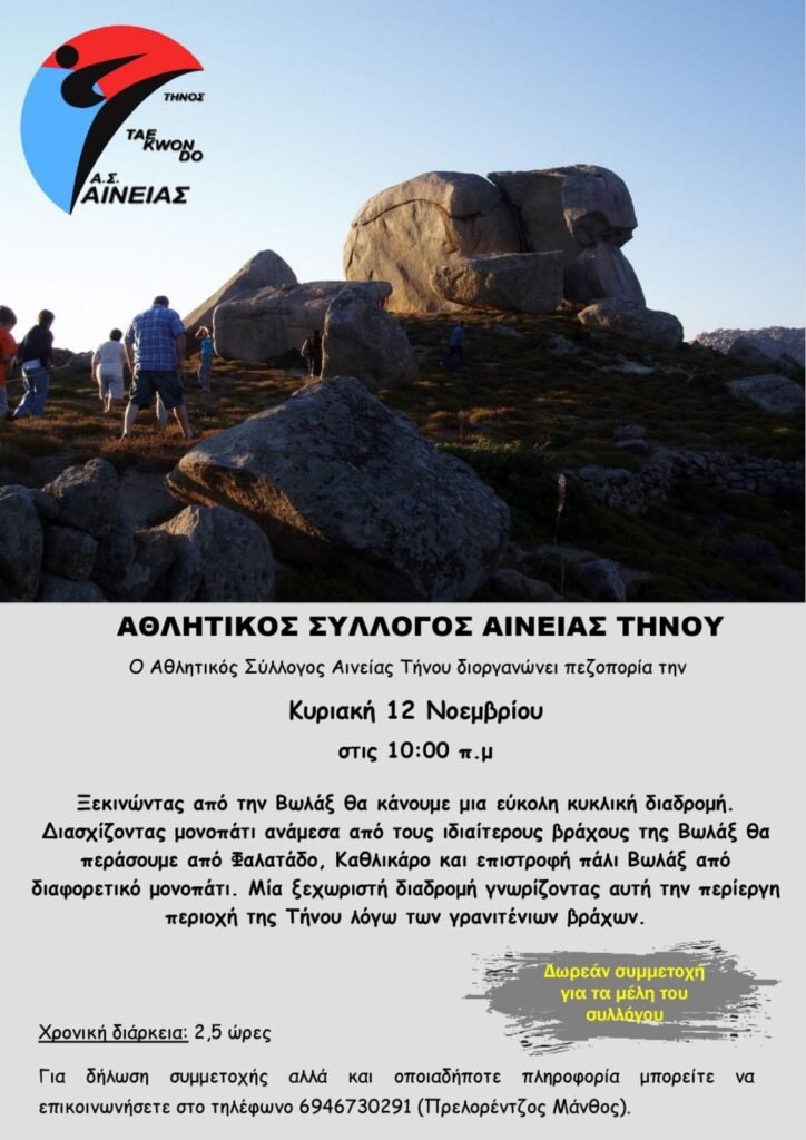 Ο Αθλητικός Σύλλογος Αινείας Τήνου διοργανώνει πεζοπορία την Κυριακή 12 Νοεμβρίου στις 10:00 πμ