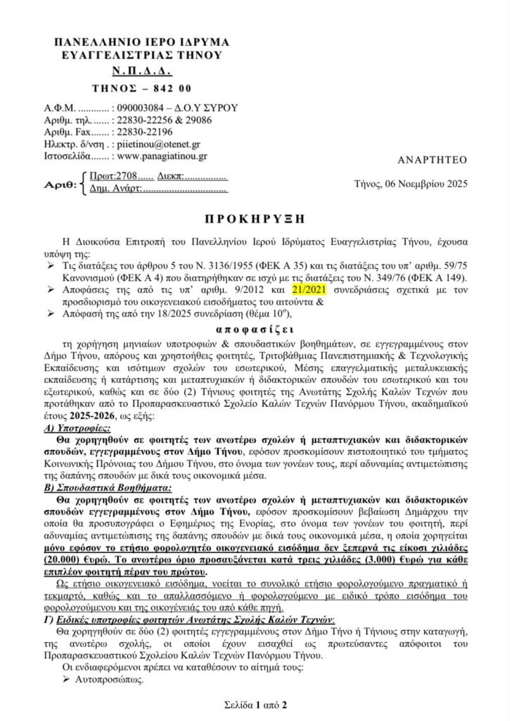 Προκήρυξη υποτροφιών και σπουδαστικών βοηθημάτων