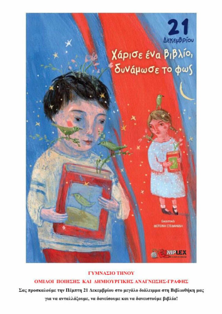 Την Πέμπτη 21 Δεκεμβρίου οι μαθητές των ομίλων Ποίησης και Δημιουργικής Ανάγνωσης – Γραφής συμμετείχαν στην πανελλήνια δράση φιλαναγνωσίας “Χάρισε ένα βιβλίο- δυνάμωσε το φως” που διοργάνωσε η εκπαιδευτική πύλη ELNIPLEX σε συνεργασία με φορείς του βιβλίου από όλη τη χώρα. Στη Βιβλιοθήκη του σχολείου οργανώθηκε δανειστική έκθεση με επιλογή βιβλίων από τη συλλογή του σχολείου, των μαθητών και των καθηγητών. Στο πλαίσιο της δράσης, η Βιβλιοθήκη διακοσμήθηκε σε χριστουγεννιάτικο πνεύμα από μαθητές, και μοιράστηκαν αναμνηστικοί σελιδοδείκτες που κατασκεύασαν μαθητές στο μάθημα των Εικαστικών. Τα παιδιά των ομίλων σε ρόλο βιβλιοθηκονόμου καθοδηγούσαν τους συμμαθητές τους και κατέγραφαν τα βιβλία στο έντυπο δανεισμού.