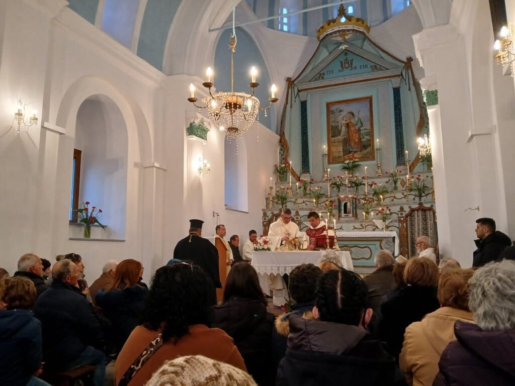 Ο ναός υπέροχα στολισμένος και πεντακάθαρος, υποδέχτηκε τους πιστούς και τον αρχιεπίσκοπο μας π. Ιωσήφ, ο οποίος προέστη του συλλείτουργου μαζί με όλους τους ιερείς του νησιού μας, κηρύττοντας κατάλληλα τον θείο λόγο.