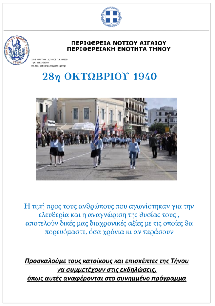 Οι εκδηλώσεις για τον εορτασμό της επετείου της 28ης Οκτωβρίου 1940 στην έδρα της Περιφερειακής Ενότητας Τήνου στην πόλη της Τήνου περιλαμβάνουν: