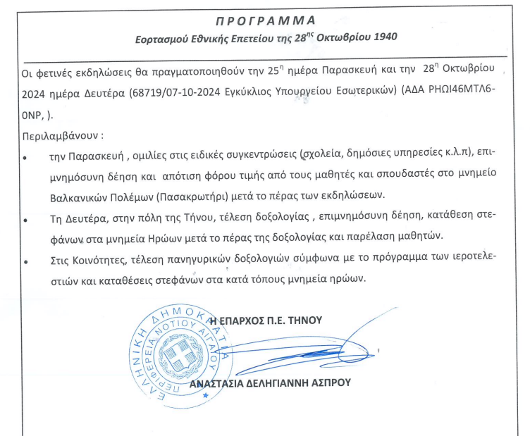 ΩΡΑ 10:15 π.μ. :Προσέλευση σχολείων εντός του Ι.Ν. Ευαγγελιστρίας και πέρας προσέλευσης επισήμων ΩΡΑ 10:30 π.μ. :Πανηγυρική Δοξολογία στον Ιερό Ναό Ευαγγελιστρίας. Ακολουθεί τέλεση επιμνημόσυνης δέησης και κατάθεση στεφάνων στο κενοτάφιο Κ/Δ «ΕΛΛΗ» τηρουμένων των με αρ. 76632/20-10-2021 (ΦΕΚ 4961/τ.Β/26-10-2021), υπουργικών αποφάσεων, από τον Δήμαρχο Τήνου κ. Παναγιώτη Κροντηρά, την Έπαρχο Τήνου κα Αναστασία Δεληγιάννη– Άσπρου και τον Λιμενάρχη Τήνου κ. Ανδρέα Μάρκο.