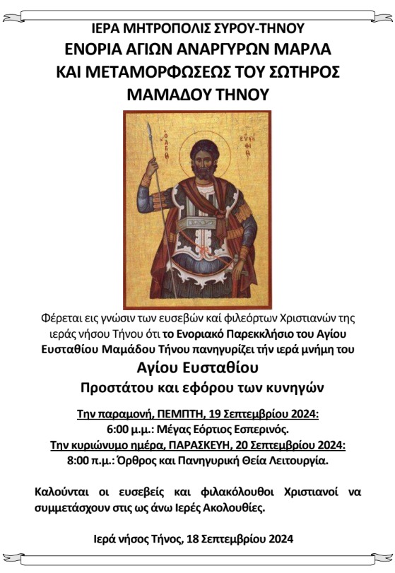 Φέρεται εις γνώσιν των ευσεβών καί φιλεόρτων Χριστιανών της ιεράς νήσου Τήνου ότι το Ενοριακό Παρεκκλήσιο του Αγίου Ευσταθίου Μαμάδου Τήνου πανηγυρίζει τήν ιερά μνήμη του Αγίου Ευσταθίου Προστάτου και εφόρου των κυνηγών