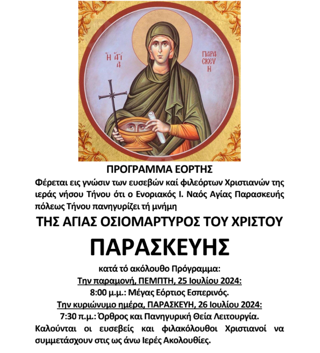 Πρόγραμμα εορτασμού Αγίας Παρασκευής Πόλεως Τήνου