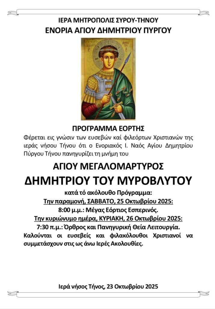 Πρόγραμμα Εορτασμού Αγίου Δημητρίου Πύργου
