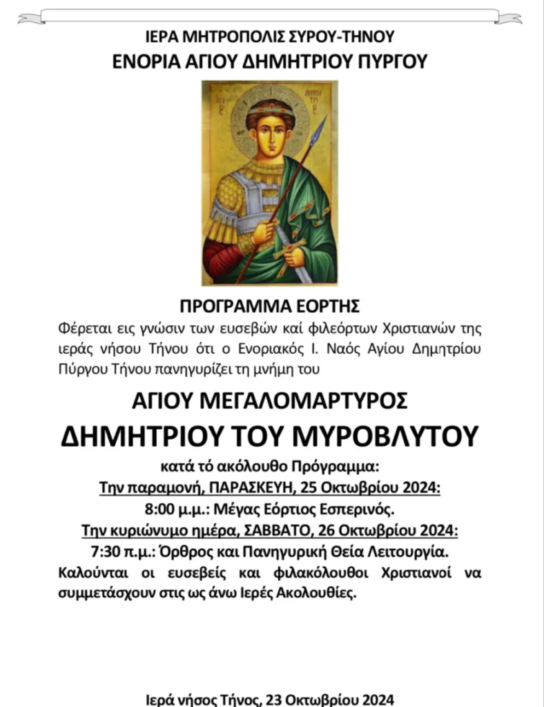 Φέρεται εις γνώσιν των ευσεβών καί φιλεόρτων Χριστιανών της ιεράς νήσου Τήνου ότι ο Ενοριακός Ι. Ναός Αγίου Δημητρίου Πύργου Τήνου πανηγυρίζει τη μνήμη του