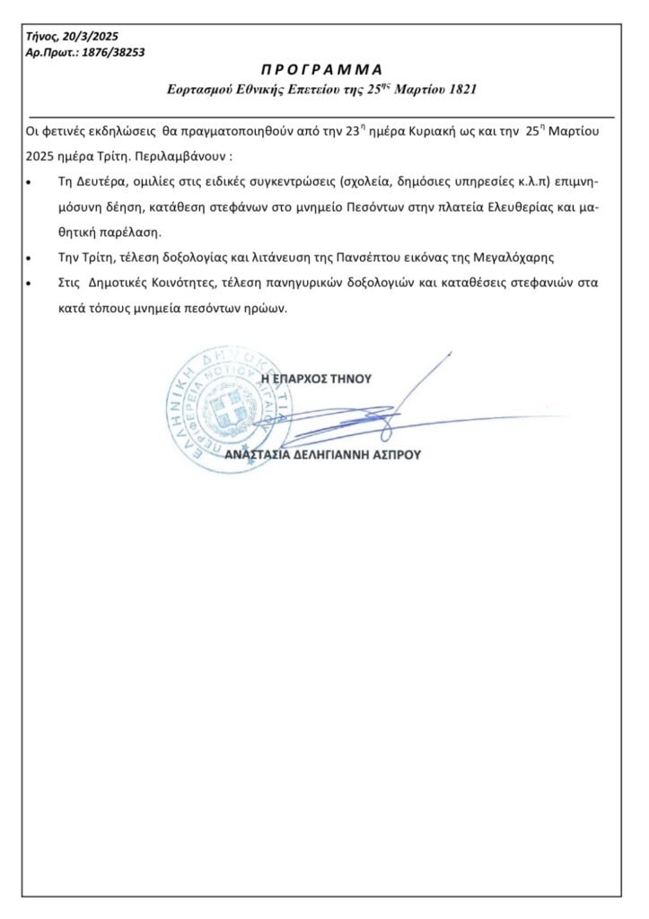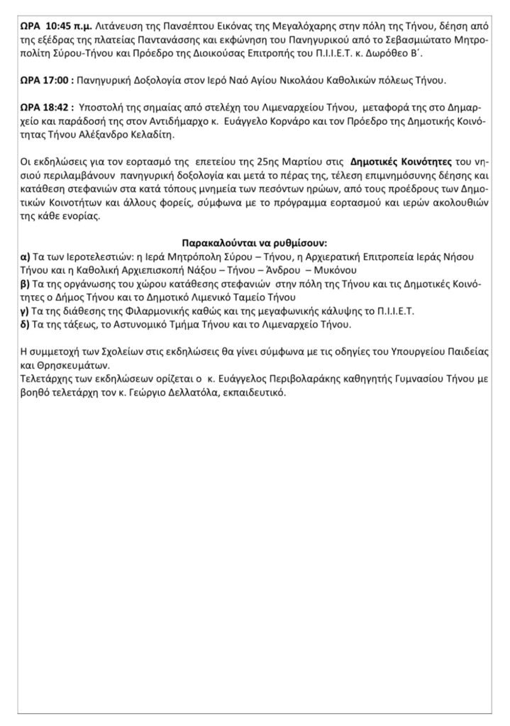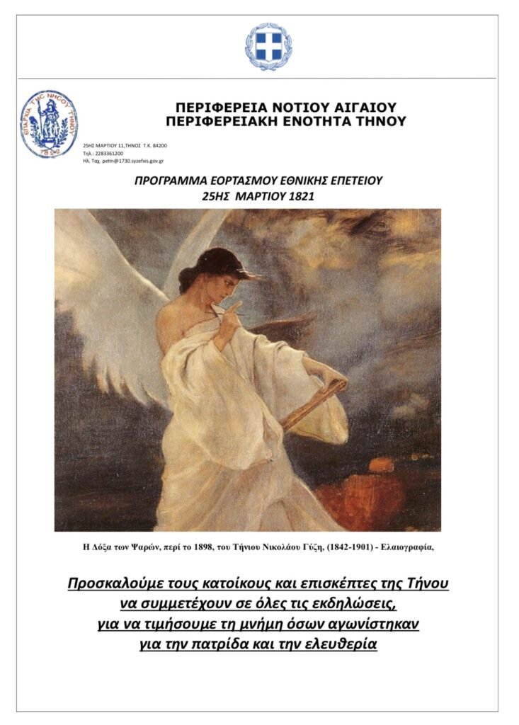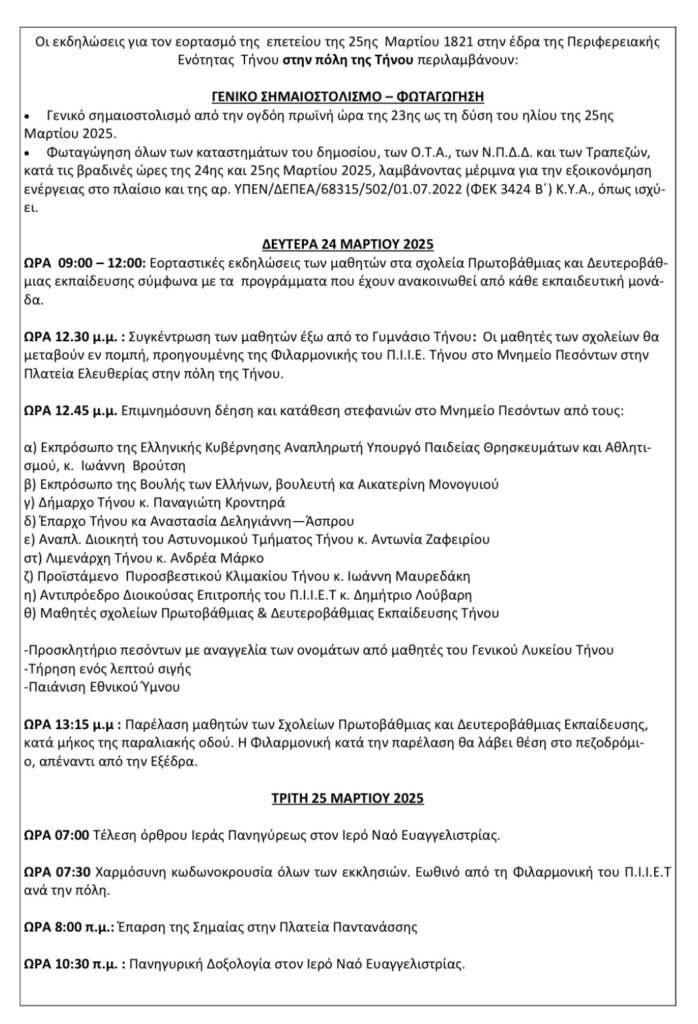 Προσκαλούμε τους κατοίκους και επισκέπτες της Τήνου να συμμετέχουν σε όλες τις εκδηλώσεις, για να τιμήσουμε τη μνήμη όσων αγωνίστηκαν για την πατρίδα και την ελευθερία.