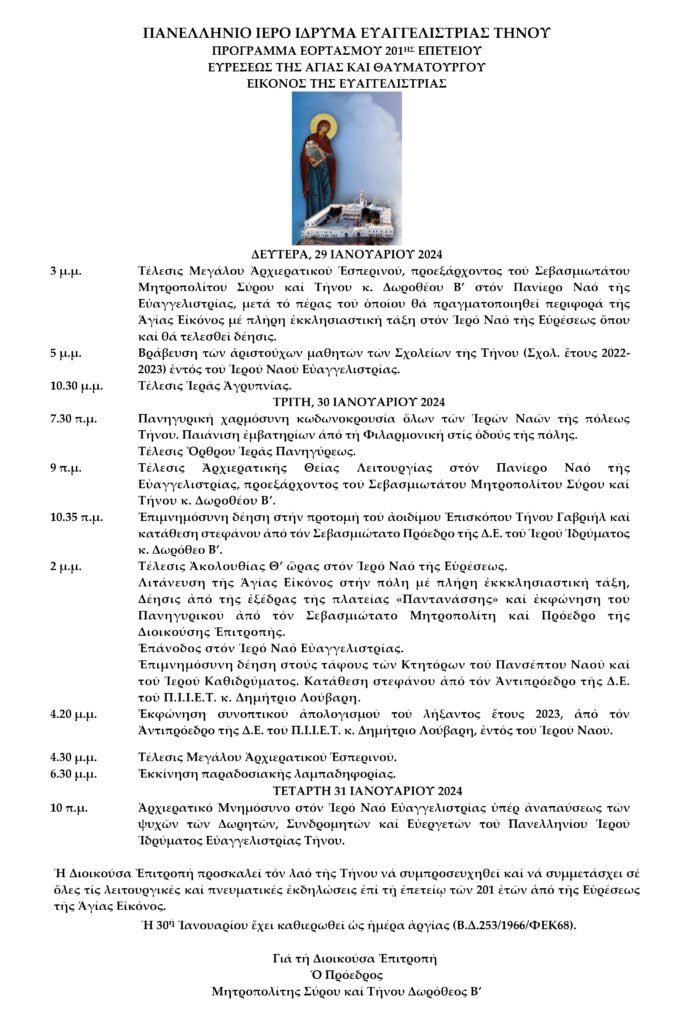 Ἡ Διοικούσα Ἐπιτροπή προσκαλεῖ τόν λαό τῆς Τήνου νά συμπροσευχηθεῖ καί νά συμμετάσχει σέ ὅλες τίς λειτουργικές καί πνευματικές ἐκδηλώσεις ἐπί τῇ ἐπετείῳ τῶν 201 ἐτῶν ἀπό τῆς Εὑρέσεως τῆς Ἁγίας Εἰκόνος.