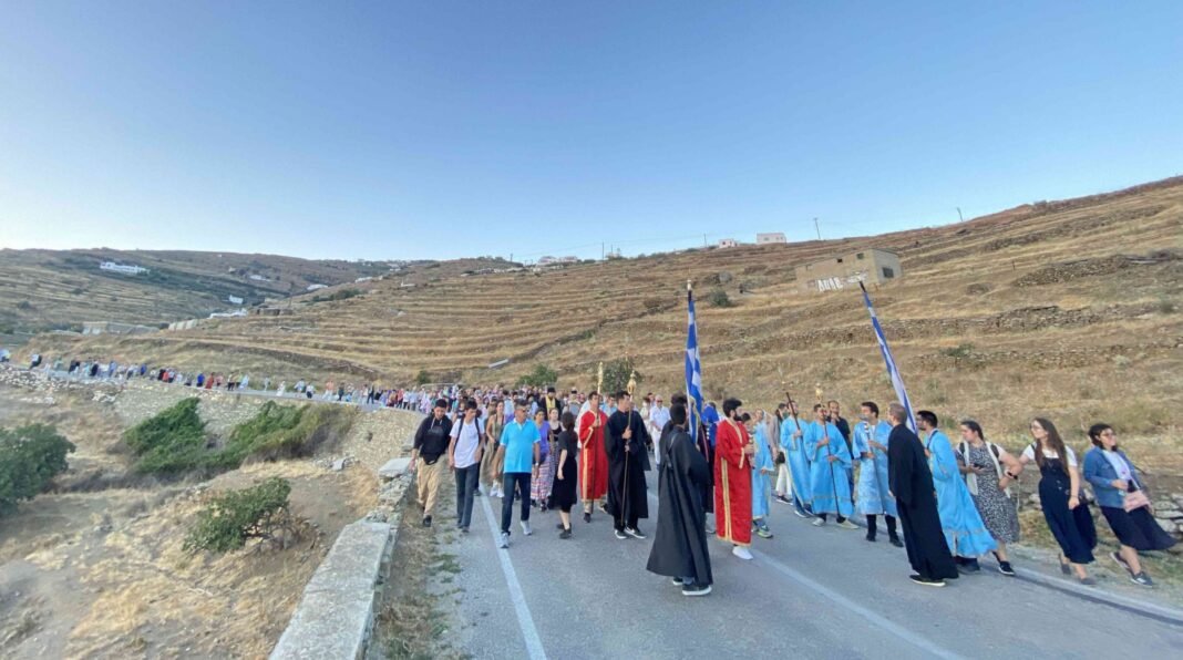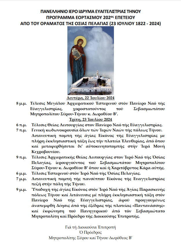 7 μ.μ. Λιτανευτική πομπή τῆς πανσέπτου Εἰκόνος τῆς Ευαγγελιστρίας πεζή στήν πόλη τῆς Τήνου.