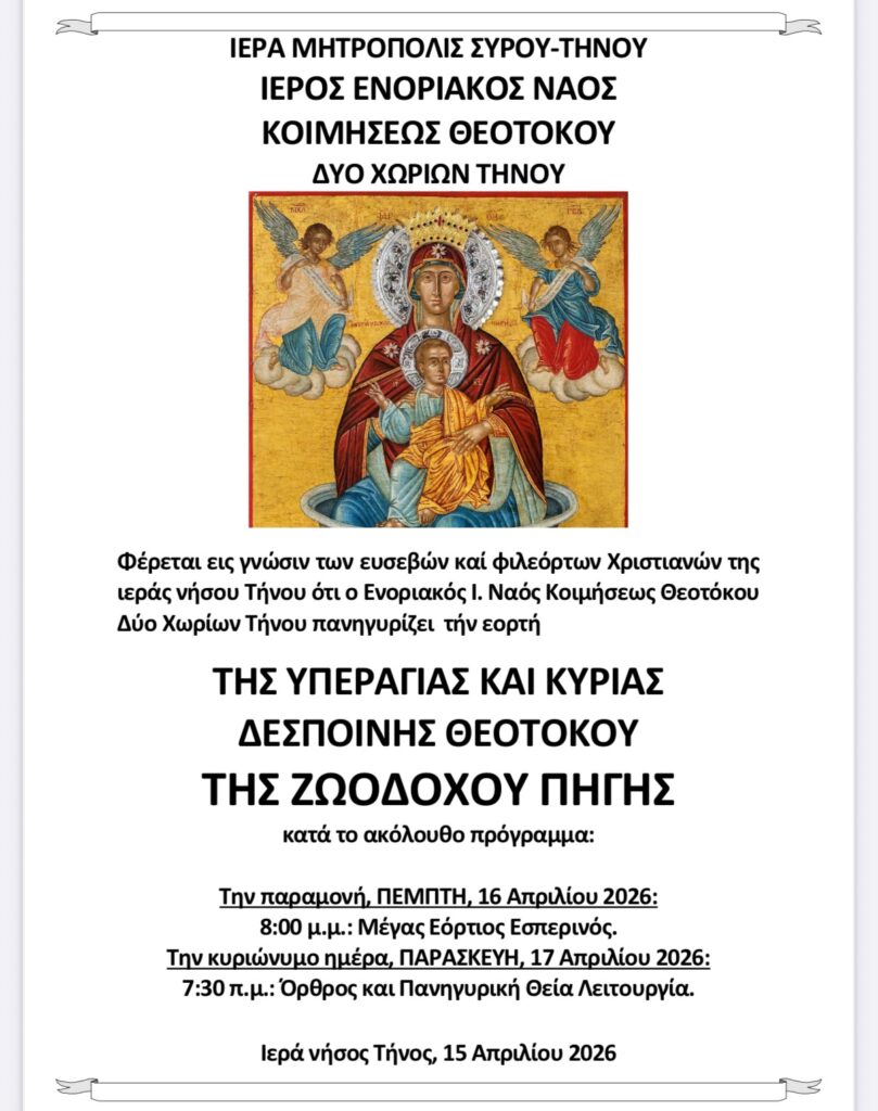 Με τη δέουσα εκκλησιαστική λαμπρότητα και θρησκευτική ευλάβεια, το πανέμορφο χωριό των Δύο Χωριών στην Τήνο ετοιμάζεται να τιμήσει την εορτή της Παναγίας Ζωοδόχου Πηγής. Ο Ιερός Ενοριακός Ναός Κοιμήσεως της Θεοτόκου απευθύνει κάλεσμα σε όλους τους ευσεβείς χριστιανούς και φιλέορτους κατοίκους του νησιού να συμμετάσχουν στις λατρευτικές εκδηλώσεις που θα λάβουν χώρα το διήμερο 16 και 17 Απριλίου 2026.