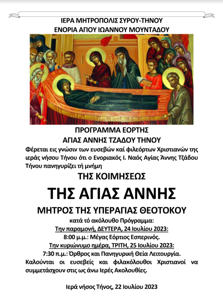 Φέρεται εις γνώσιν των ευσεβών καί φιλεόρτων Χριστιανών της ιεράς νήσου Τήνου ότι ο Ενοριακός Ι. Ναός Αγίας Άννης Τζάδου Τήνου πανηγυρίζει τή μνήμη ΤΗΣ ΚΟΙΜΗΣΕΩΣ ΤΗΣ ΑΓΙΑΣ ΑΝΝΗΣ ΜΗΤΡΟΣ ΤΗΣ ΥΠΕΡΑΓΙΑΣ ΘΕΟΤΟΚΟΥ κατά τό ακόλουθο Πρόγραμμα:
