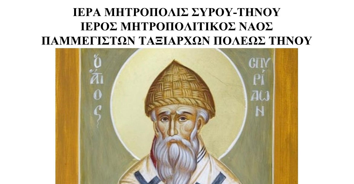 Φέρεται εις γνώσιν των ευλαβών καί φιλεόρτων Χριστιανών της ιεράς νήσου Τήνου ότι ο Ι. Ναός Αγίου Σπυρίδωνος πόλεως Τήνου πανηγυρίζει τη μνήμη