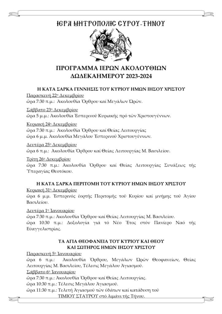 Πρόγραμμα Ιερών Ακολουθιών Δωδεκαημέρου 2023-2024