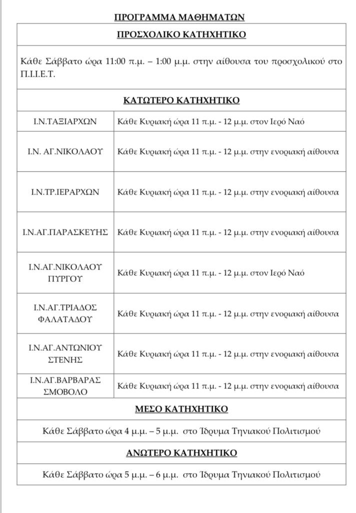 Με πολλή χαρά σάς καλωσορίζουμε στην έναρξη των κατηχητικών μας μαθημάτων για τη φετινή χρονιά. Η αγάπη μας για τα παιδιά και τους νέους του νησιού, μας καλεί να βρισκόμαστε δίπλα σας, για να προσφέρουμε ό,τι καλύτερο μπορούμε. Το