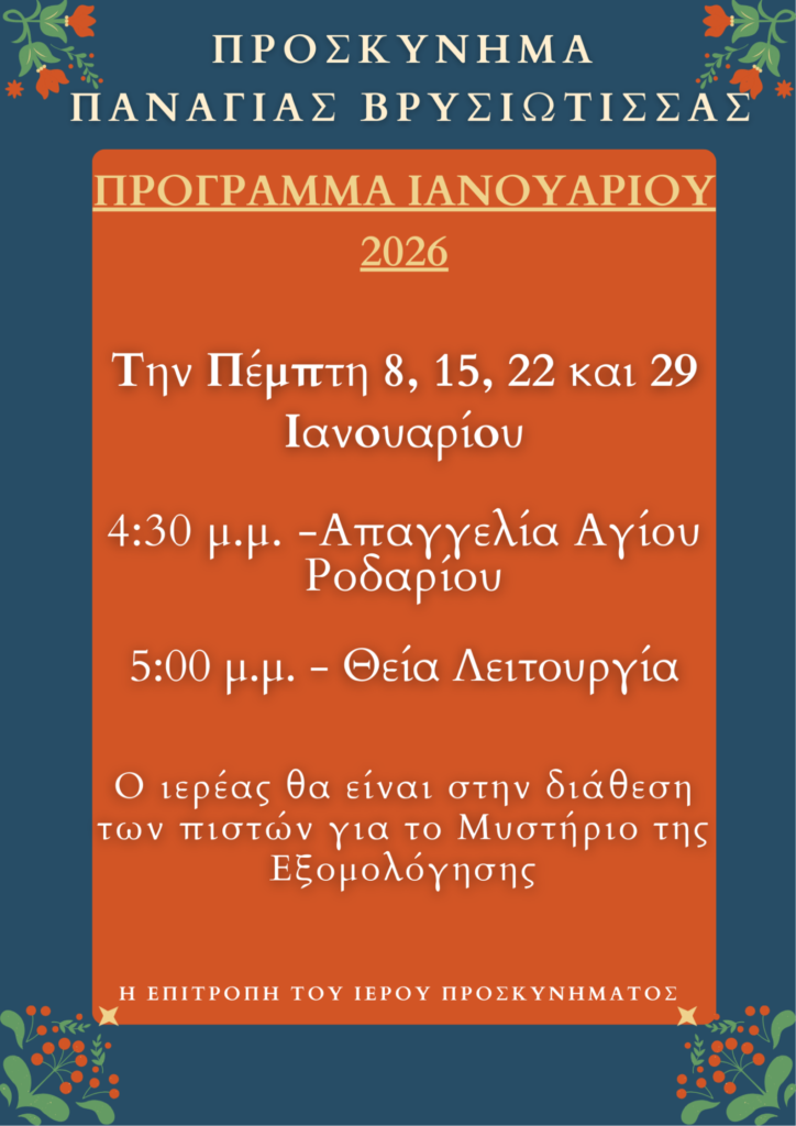 Πρόγραμμα του Προσκυνήματος της Παναγίας Βρυσιώτισσας – Ιανουάριος 2026