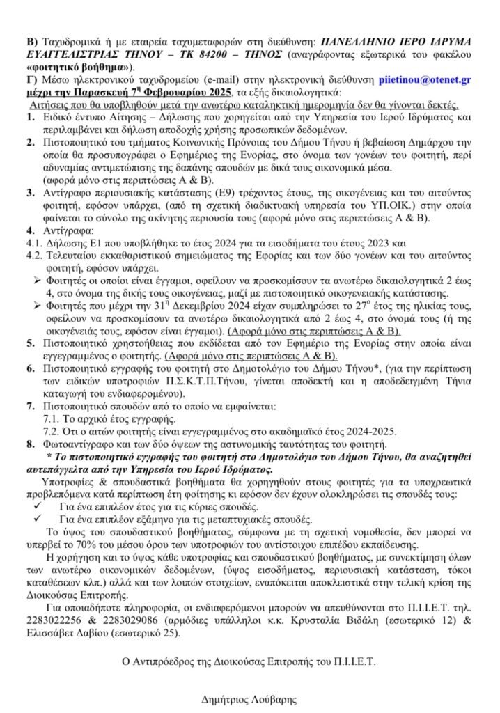Το Πανελλήνιο Ιερό Ίδρυμα Ευαγγελιστρίας Τήνου (Π.Ι.Ι.Ε.Τ.) ανακοινώνει την προκήρυξη χορήγησης υποτροφιών και σπουδαστικών βοηθημάτων για το ακαδημαϊκό έτος 2024-2025. Οι ενισχύσεις απευθύνονται σε φοιτητές ανώτερων σχολών, μεταπτυχιακών και διδακτορικών σπουδών, οι οποίοι είναι εγγεγραμμένοι στον Δήμο Τήνου και πληρούν τα απαραίτητα κοινωνικά και οικονομικά κριτήρια.