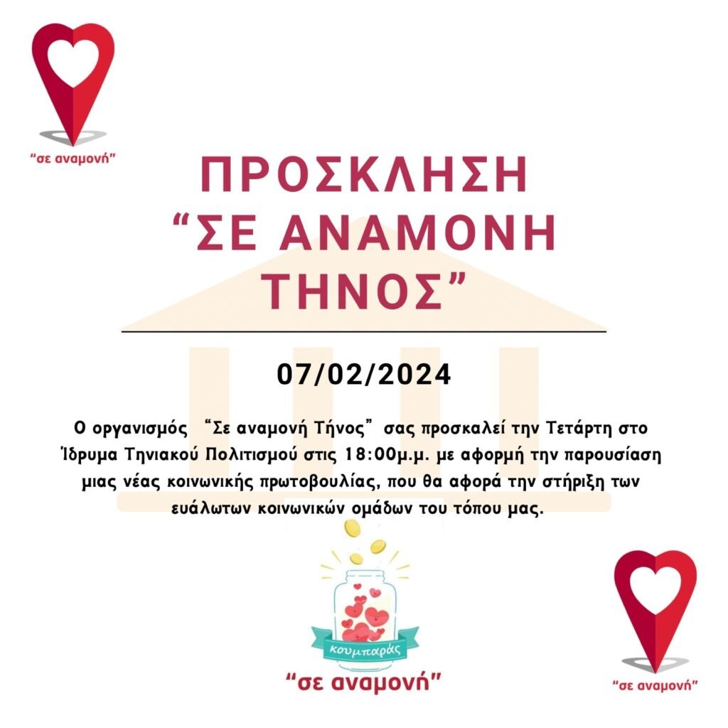 Δείτε ζωντανά την παρουσίαση της νέας κοινωνικής πρωτοβουλίας “Σε αναμονή” σήμερα στις 18:00 στο Ίδρυμα Τηνιακού Πολιτισμού, που θα αφορά την στήριξη των ευάλωτων κοινωνικών ομάδων του τόπου μας.