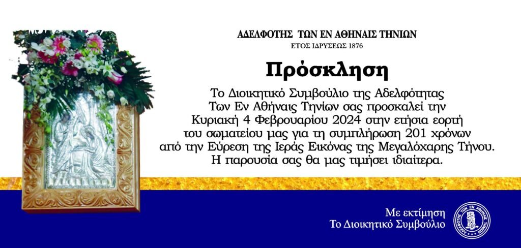 Το Διοικητικό Συμβούλιο της Αδελφότητας Των Εν Αθήναις Τηνίων σας προσκαλεί την Κυριακή 4 Φεβρουαρίου 2024 στην ετήσια εορτή του σωματείου μας για τη συμπλήρωση 201 χρόνων από την Εύρεση της