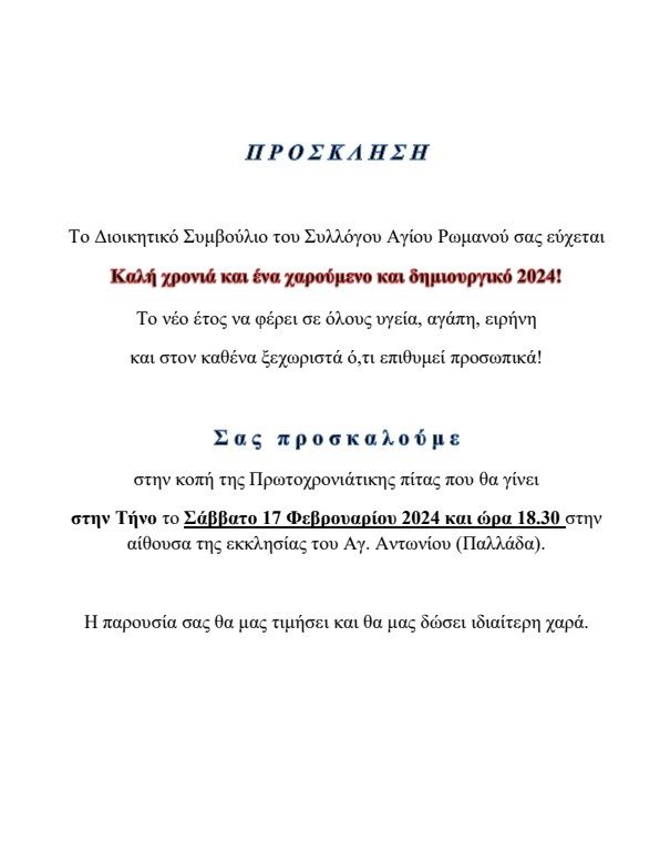 Σας προσκαλούμε στην κοπή της Πρωτοχρονιάτικης πίτας που θα γίνει στην Τήνο, το Σάββατο, 17 Φεβρουαρίου και ώρα 18.30 στην αίθουσα της εκκλησία του Αγίου Αντωνίου (Παλλάδα).