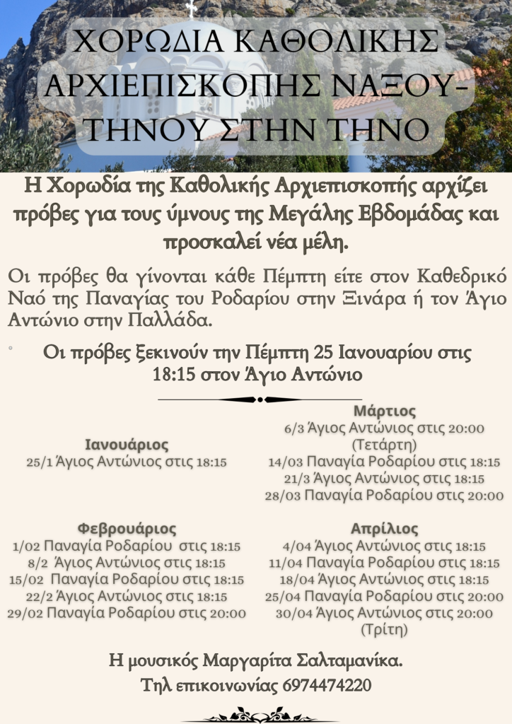 Η Χορωδία της καθολικής Αρχιεπισκοπής αρχίζει πρόβες για τους ύμνους της Μεγάλης Εβδομάδας και προσκαλεί νέα μέλη.