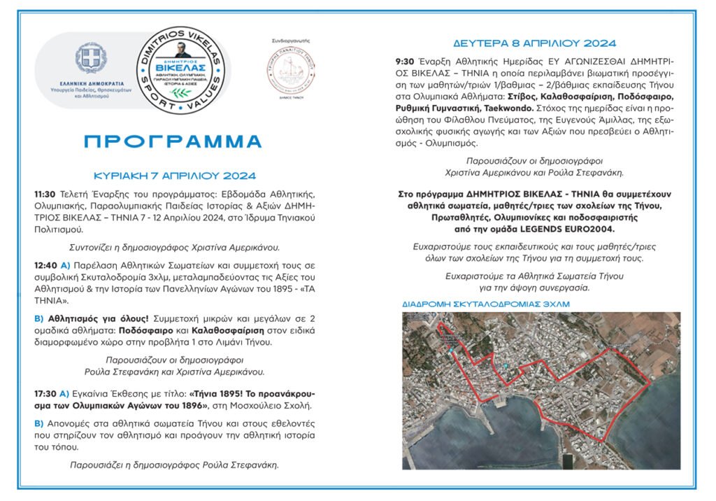 Ολυμπιακής, Παραολυμπιακής Παιδείας Ιστορίας & Αξιών ΔΗΜΗΤΡΙΟΣ ΒΙΚΕΛΑΣ – ΤΗΝΙΑ 7 – 12 Απριλίου 2024, στο Ίδρυμα Τηνιακού