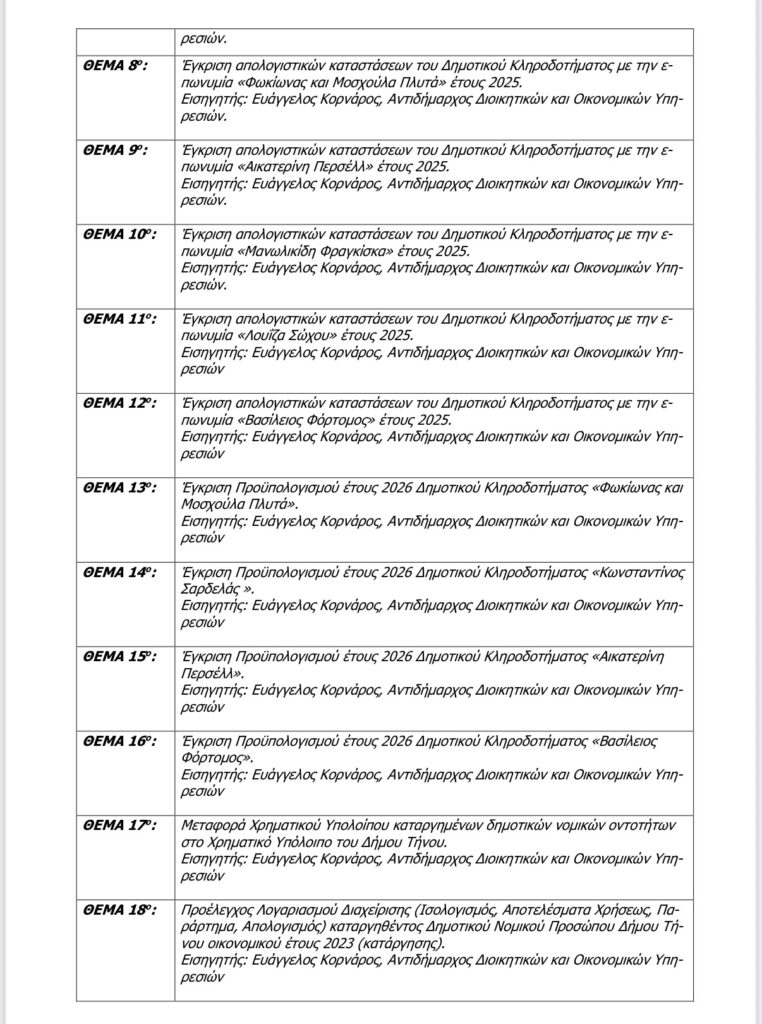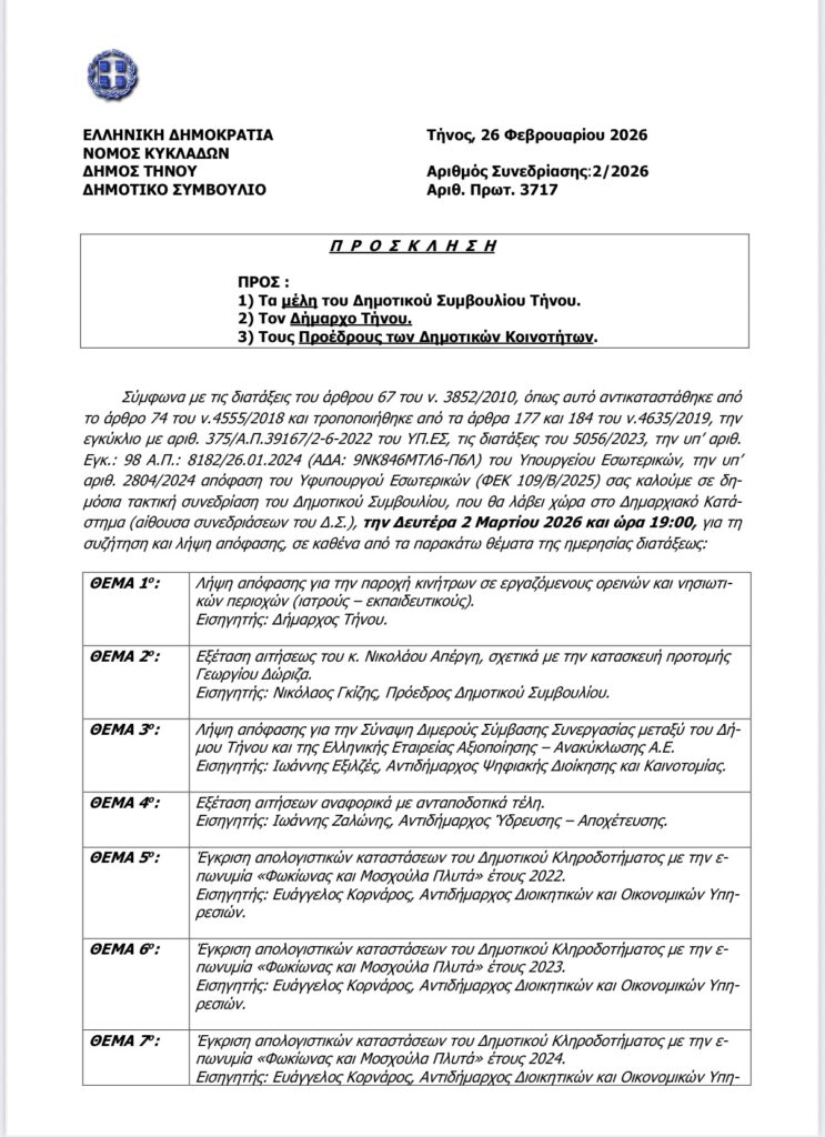 Σας ενημερώνουμε ότι, σύμφωνα με τις ισχύουσες νομοθετικές διατάξεις και τις σχετικές εγκυκλίους του Υπουργείου Εσωτερικών, καλείστε σε δημόσια τακτική συνεδρίαση του Δημοτικού Συμβουλίου. Η συνεδρίαση θα πραγματοποιηθεί στο στην αίθουσα συνεδριάσεων του Δ.Σ., τη Δευτέρα 2 Μαρτίου 2026 και ώρα 19:00.