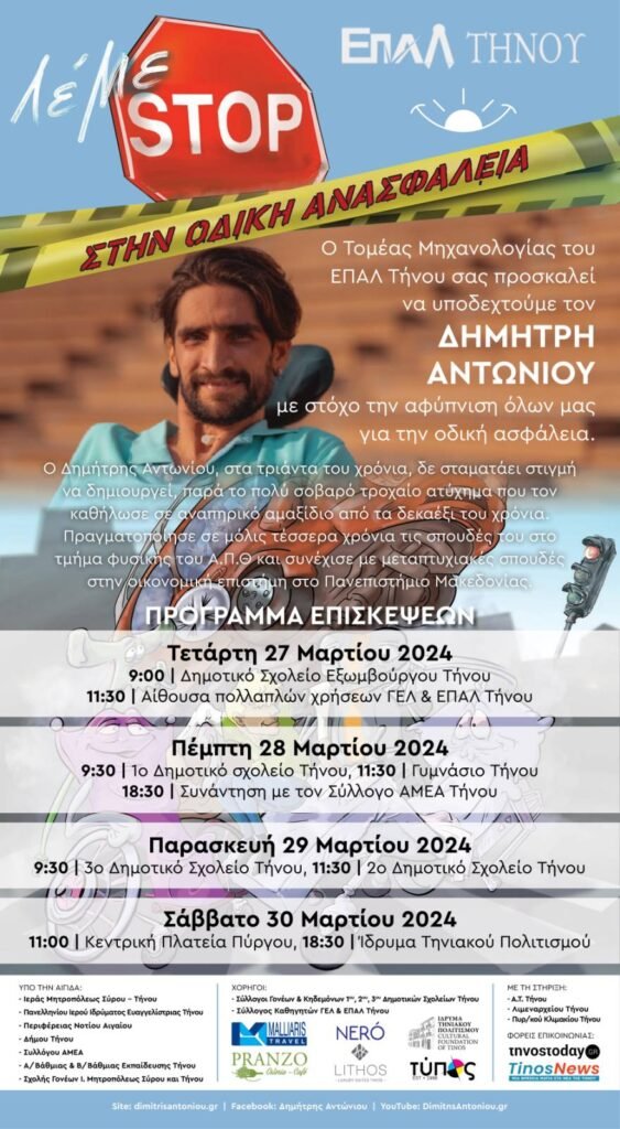 Ο τομέας Μηχανολογίας του ΕΠΑΛ Τήνου, στο πλαίσιο δράσεων ευαισθητοποίησης των μαθητών της Τοπικής κοινωνίας για την οδική συμπεριφορά, έχει προσκαλέσει τον κ. Δημήτρη Αντωνίου ώστε να πραγματοποιήσει εκπαιδευτικές επισκέψεις στα σχολεία, στους φορείς και  Συλλόγους του νησιού. Οι εκπαιδευτικές αυτές επισκέψεις του κ. Αντωνίου, με τον βιωματικό του λόγο και με σύμμαχο το κόμικ του, ‘’Λέμε STOP στην οδική ανασφάλεια’’, είναι μια σημαντική προσπάθεια στη διαμόρφωση της σωστής κυκλοφοριακής συμπεριφοράς των νέων.