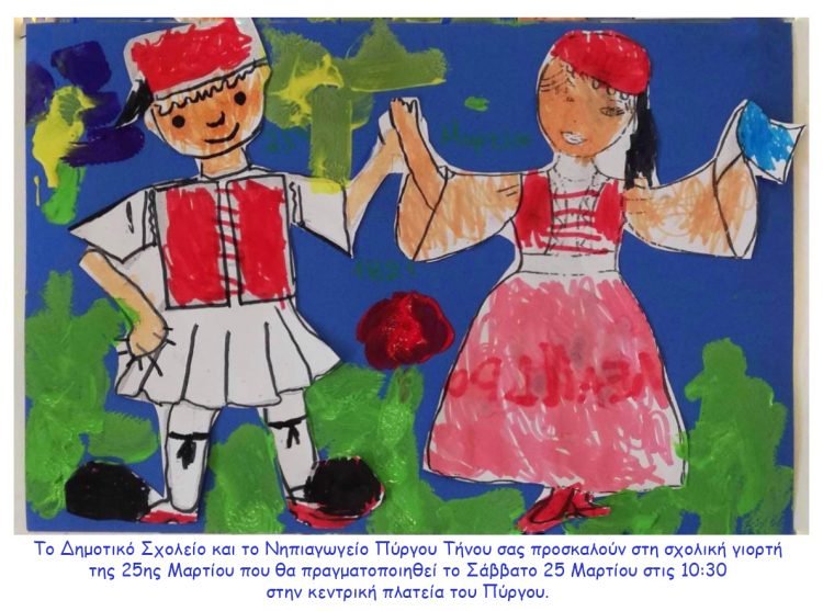 Το Δημοτικό Σχολείο και το Νηπιαγωγείο Πύργου Τήνου σας προσκαλούν στη σχολική γιορτή της 25ης Μαρτίου που θα πραγματοποιηθεί το Σάββατο 25 Μαρτίου στις 10:30 στην κεντρική πλατεία του Πύργου.