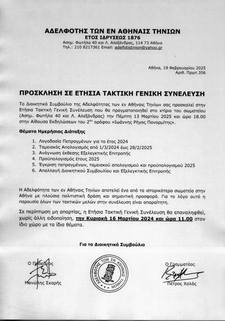 Η Αδελφότητα των εν Αθήναις Τηνίων, ένα από τα ιστορικότερα σωματεία της Αθήνας, προσκαλεί τα μέλη της στην Ετήσια Τακτική Γενική Συνέλευση, η οποία θα πραγματοποιηθεί την Πέμπτη 13 Μαρτίου 2025 στις 18:00. Η συνέλευση θα λάβει χώρα στην αίθουσα εκδηλώσεων «Ιωάννης Ρήγος Πανωρίτης» του σωματείου, που βρίσκεται στην οδό Άσημ. Φωτήλα 40 και Λ. Αλεξάνδρας.
