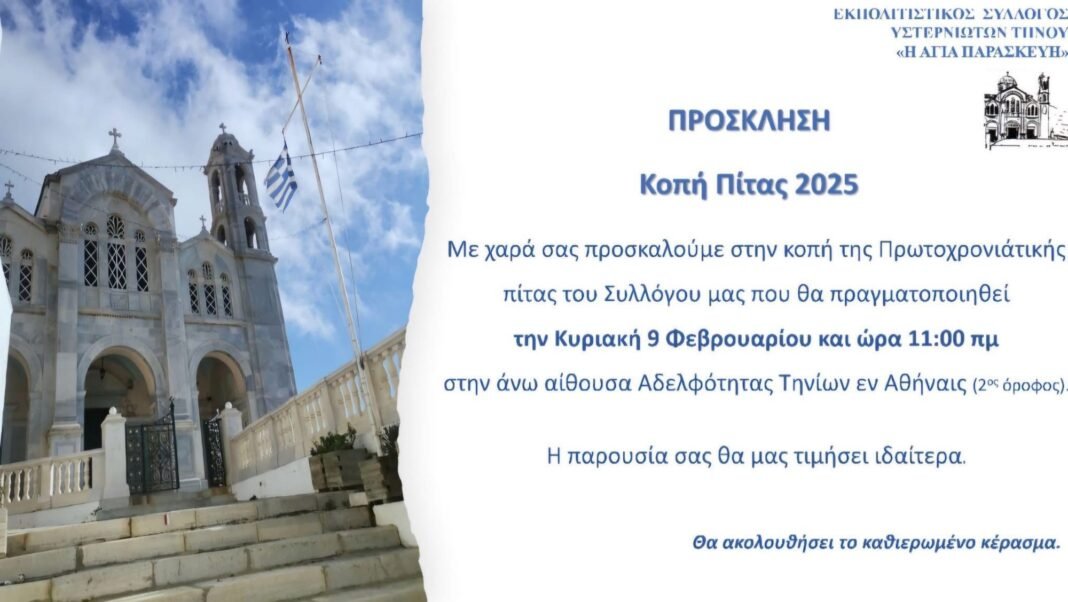 Το Διοικητικό συμβούλιο του Συλλόγου Υστερνιωτών Τήνου “Η Αγία Παρασκευή” σας προσκαλεί την Κυριακή 9 Φεβρουαρίου 2025 στις 11:00 το πρωί στην καθιερωμένη κοπή της Πρωτοχρονιάτικης Βασιλόπιτας του Συλλόγου μας.