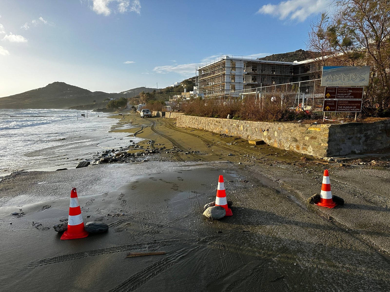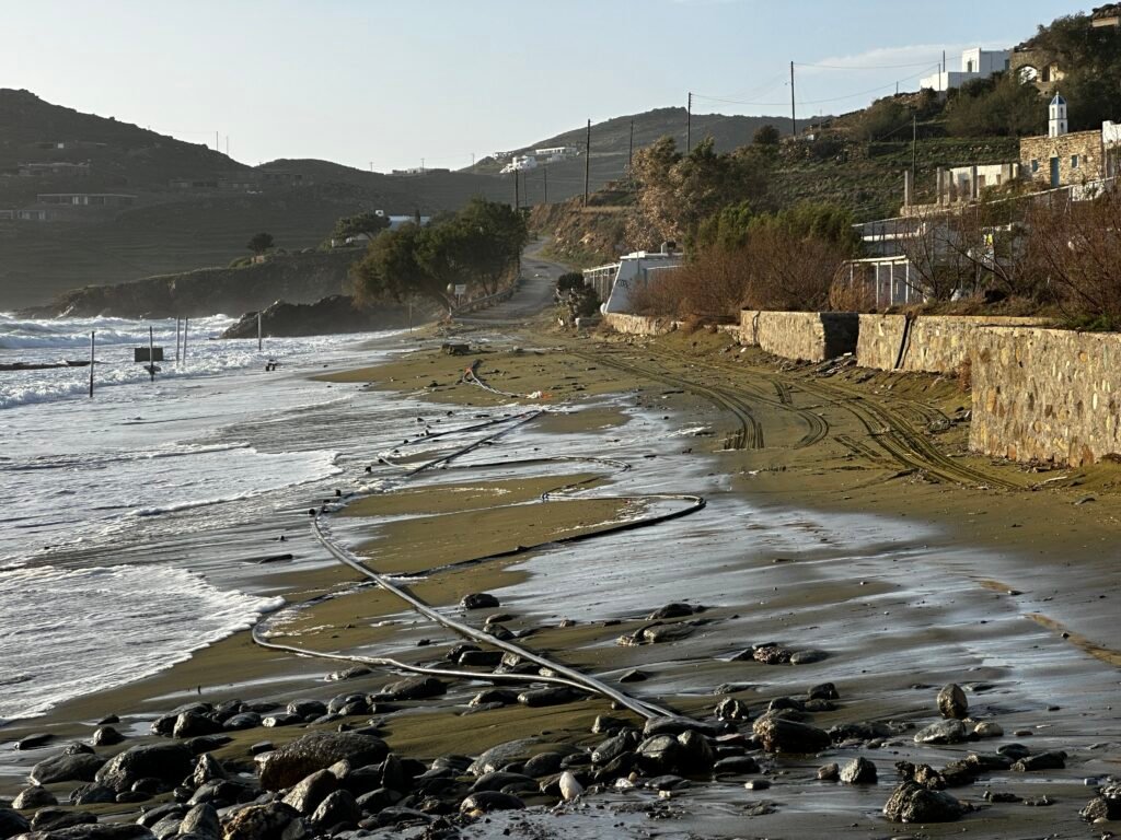 Λόγω των δυσμενών καιρικών συνθηκών, από τον ισχυρό Νοτιά που ειναι σε ισχύ, το τμήμα μπροστά από το πρώην Tinos Beach, είναι σε άσχημη κατάσταση, και άκρως επικίνδυνο να “κολλήσουν” οχήματα ξανά. Όπως θα διαπιστώσετε στις φωτογραφίες έχουν ξεγυμνωθεί ξανά οι σωλήνες και τα καλώδια, και χρειάζονται άμεσα επισκευή.