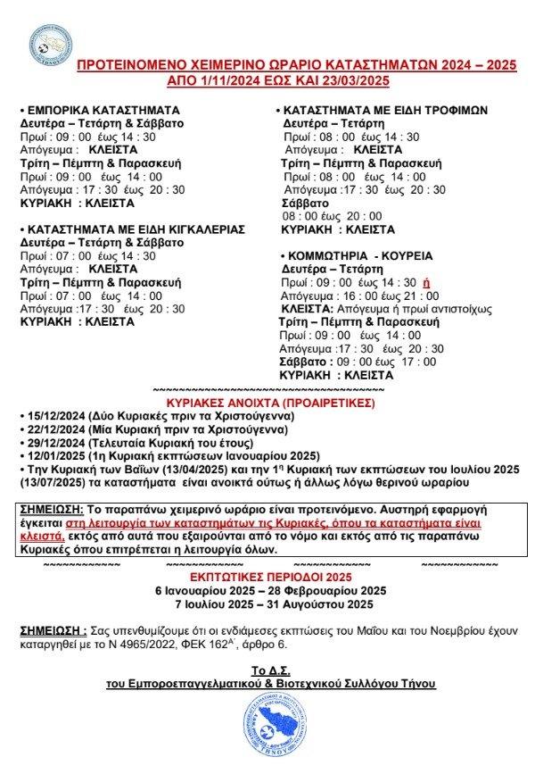 Ο Εμποροεπαγγελματικός και Βιοτεχνικός Σύλλογος Τήνου ανακοινώνει το προτεινόμενο ωράριο για την χειμερινή περίοδο.