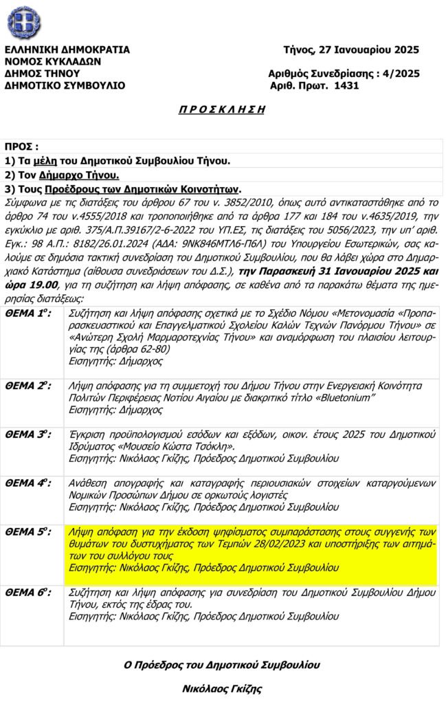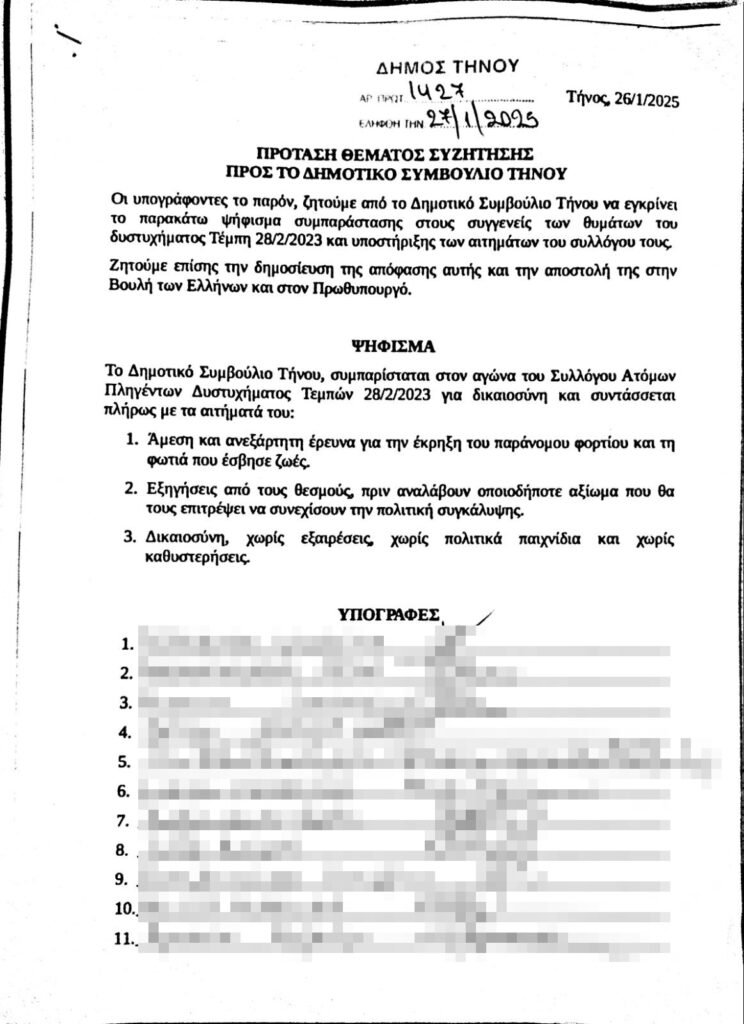 Μετά την κατάθεση πρότασης από 260 δημότες, το Δημοτικό Συμβούλιο Τήνου, συζητά την Παρασκευή 31/1/2025 στις 19.00, την έκδοση ψηφίσματος στήριξης των συγγενών των θυμάτων του δυστυχήματος Τέμπη 28.2.2023 και των αιτημάτων τους.